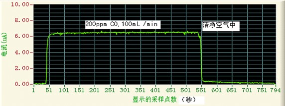 備注:以下測試數據均在20℃,50%RH,1個(gè)標準大氣壓條件下,使用新傳感器,在標準電化學(xué)測試電路中測試所得。 圖1 ES2-CO響應、恢復曲線(xiàn)